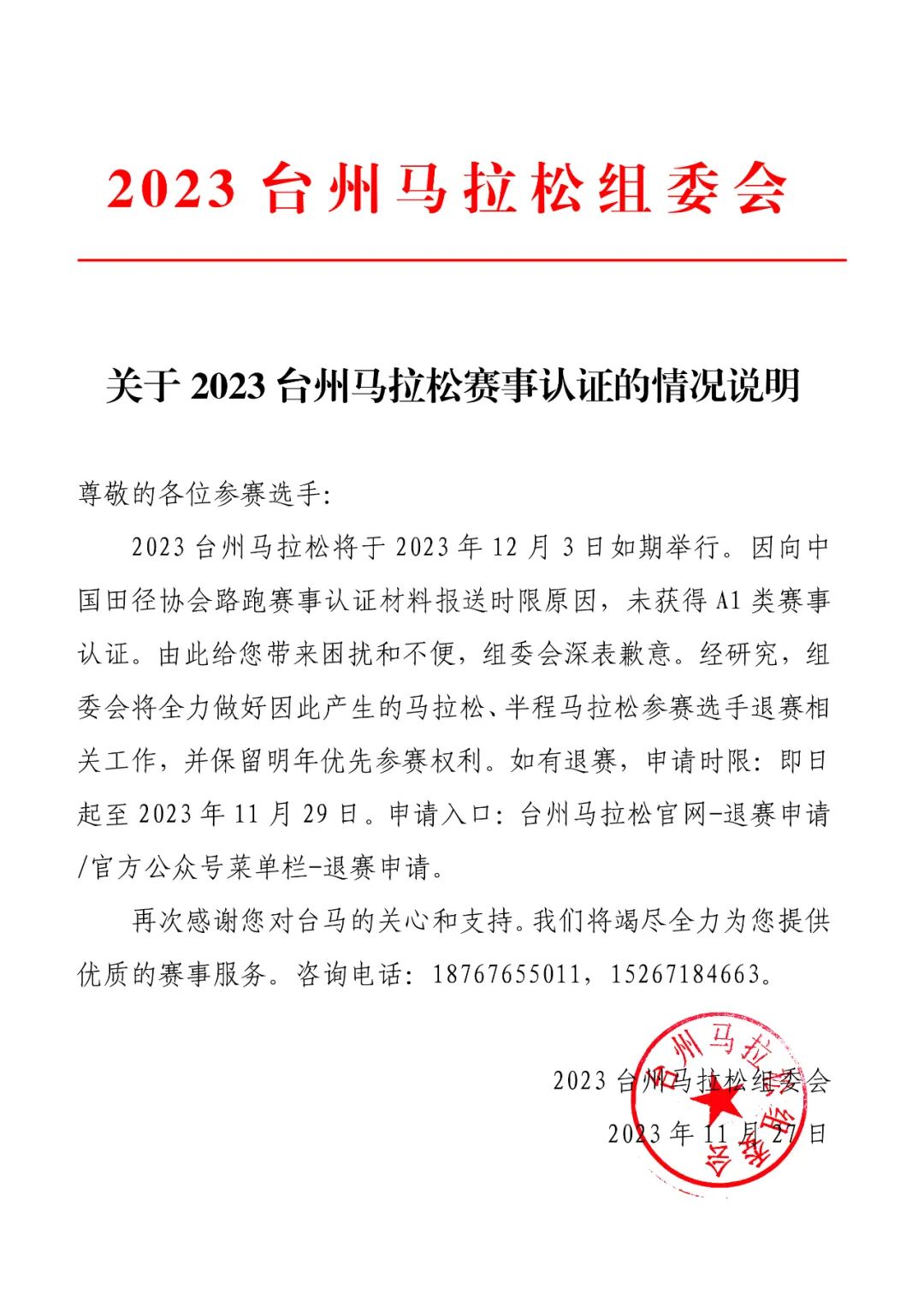 情况说明 | 吉利银河·2023台州马拉松
